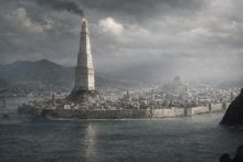 Vista desde los riscos de la Isla Batalla, una isla en el Aguamiel, las casas de los gremios bordean la ribera como una hilera de palacios; río arriba, las cúpulas y torres de la Ciudadela se alzan en ambas orillas, conectadas por puentes de piedra llenos de habitaciones y estancias; río abajo, bajo los muros de mármol negro y las ventanas en forma de arco del septo Estrellado, se arraciman las mansiones de los píos. Más allá, donde el Aguamiel se ensancha para transformarse en el Sonido Susurrante, se alza la construcción más alta de Poniente: Torrealta, la fortaleza de los Hightower, con sus almenares brillantes.
