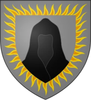 🛡️ Blasón: Un hombre encapuchado de negro en campo gris con bordura de fuego