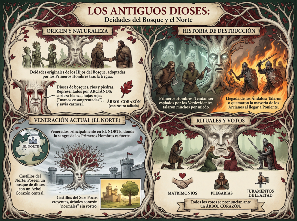- Estado Actual: En la actualidad, esta fe solo prevalece con fuerza en El Norte, donde casi todas las casas nobles siguen siendo fieles a las antiguas costumbres. Más allá del Muro, en las tierras de los salvajes, los antiguos dioses son las únicas deidades reconocidas. En el sur, aunque persisten algunos bosques de dioses en castillos antiguos, se han convertido en lugares de esparcimiento y ya no poseen arcianos tallados, salvo raras excepciones como en la Isla de los Rostros.