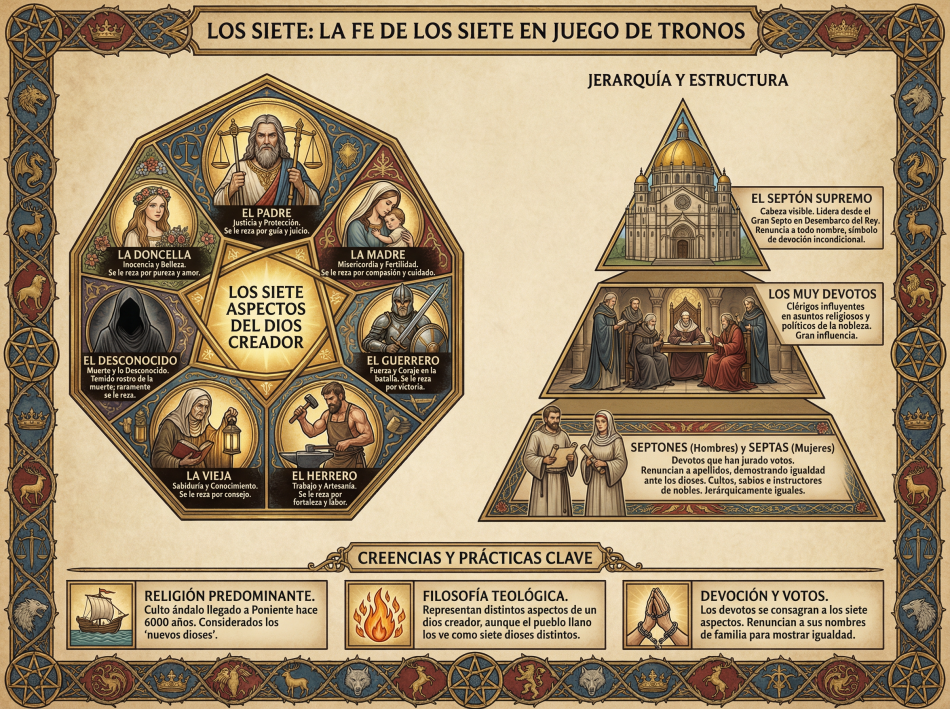 Los feligreses que estudian y predican el culto a los Siete como vocación se conocen con el nombre de devotos (septones si son hombres, septas si son mujeres). Los devotos renuncian al nombre de su familia cuando juran los votos para demostrar que son todos iguales a ojos de los dioses. La cabeza visible del culto es El Septón supremo, que lidera a sus feligreses desde el Gran Septo de Baelor, situado en Desembarco del Rey. Cuando un miembro del culto es designado septón supremo, no sólo debe renunciar al nombre de su familia, sino también al suyo propio, como símbolo de su devoción incondicional a los dioses.